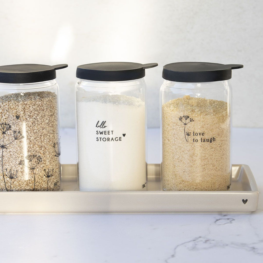 Das Aufbewahrungsglas klein mit Blumenblätter Motiv Aufdruck in Schwarz lässt Deinen Vorrat besonders stilvoll erscheinen. Die Gläser haben einen schwarzem Deckel aus Gummi und sortieren Deinen Schrank in einem coolen Look. (Bild 2 unten rechts)