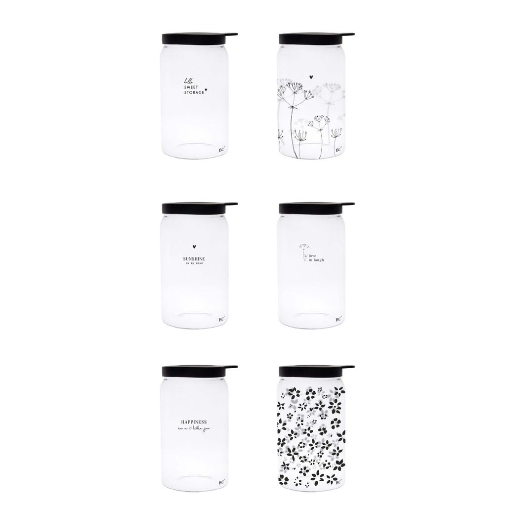Das Aufbewahrungsglas klein mit Blume und "love to laugh" Aufdruck in Schwarz lässt Deinen Vorrat besonders stilvoll erscheinen. Die Gläser haben einen schwarzem Deckel aus Gummi und sortieren Deinen Schrank in einem coolen Look. (Bild 1 Mitte rechts)