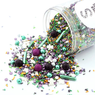 Mit diesem wundervollen Stresuelmix hast du alles, was du für eine schaurigschöne Kuchenparty brauchst: weiße Geisterstreusel, lila, grüne und gruselschwarze Zuckerstreusel, lila Konfetti und Perlchen, gemixt mit unseren Super Streusel Stars: grün-metallic glänzende Knusperkügelchen und große lila und schwarze Schokokugeln mit zartem Schokokern. Dazu noch ein Schwung grüne Zuckersticks - da vergisst man vor lauter Streuselfreude ja fast sich zu gruseln! Buh.