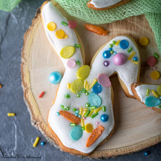 HattuMörchen? Viele sogar, alle in Form von supersüßen kleinen Möhrchen-Streuseln! Dazu bunte Osterei-Streusel, Konfetti, Streusel in allen Osterfarben, pastelligzarte Schokokugeln und für den besonderen Glanz kleine goldene Schokokugeln. Er wird jeden deiner Oster-Cupcakes, Cake Pops oder die Möhrchentorte zum Ostersonntag Brunch fantastisch bunt machen.