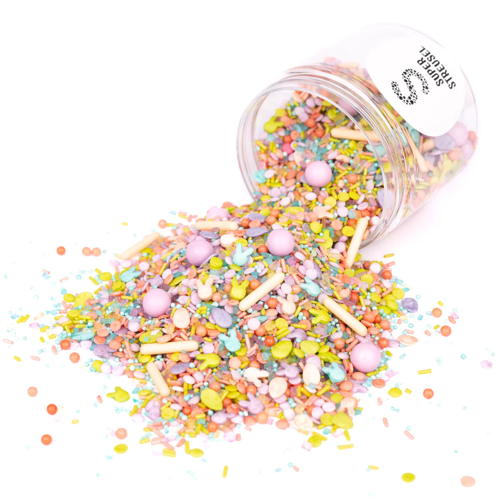 Yummy, fröhlich mümmeln die kleinen bunten Häschen vor sich hin. Aber nicht, dass sie das Osterfest verpassen! Konfettistreusel in zartem Flieder, kräftigem Peach und Grasgrün, dazu Schokokugeln in Flieder und Zuckersticks in Peach. Highlight sind natürlich die schnuckeligen Hasenköpfe und die süßen Ostereier.