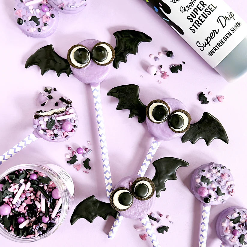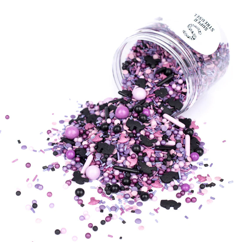 Der SuperStreusel DreiMalSchwarzerKater enthält schwarze Katzen Streusel, fliederfarbene Hexenhut Streusel, lila und fliederfarbene Schokokugeln, schwarze Zuckersticks sowie KügelchenStreusel und KonfettiStreusel in schwarz und lila.