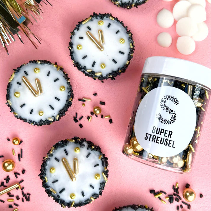 Mit dem Superstreusel Goldrausch treffen sich zwei wunderbare Gegensätze: gold, strahlend, glänzend und schwarz, dunkel. Die großen und kleinen, runden, goldenen Brummer im Mix sind wieder mit knackig leckerer Schoki gefüllt. Also schön soft & zum mitessen gedacht.