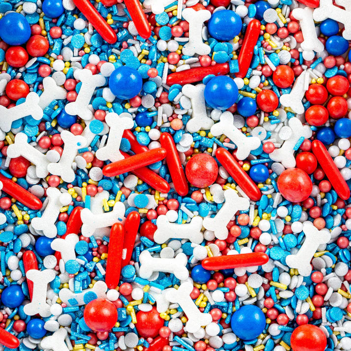 WuffWuff ist der Streusel Mix für alle Freunde auf vier Pfoten! Der Mix mit den süßen KnochenStreuseln passt perfekt auf GeburtstagsTorten und GeburtstagsMuffins. Blaue und weiße KonfettiStreusel, gelbe Nonpareilles und blaue und rote Schokokugeln machen diesen HundeStreuselMix zu einem deiner süßen PartyHighlights.
