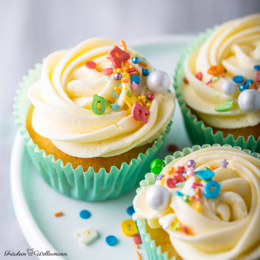 Ganz groß ist auch unser Streuselmix zur Einschulung, mit glimmerschimmerschönen Buchstaben-Streusel sowie bunten Streuselperlchen und großen, zarten Schokokugeln (optimopti für iDötzchen-Milchzähne). Damit zauberst du den perfekten Einschulungskuchen, bunte Cupcakes zur Einschulung oder Cake Pops für den ersten Schultag.