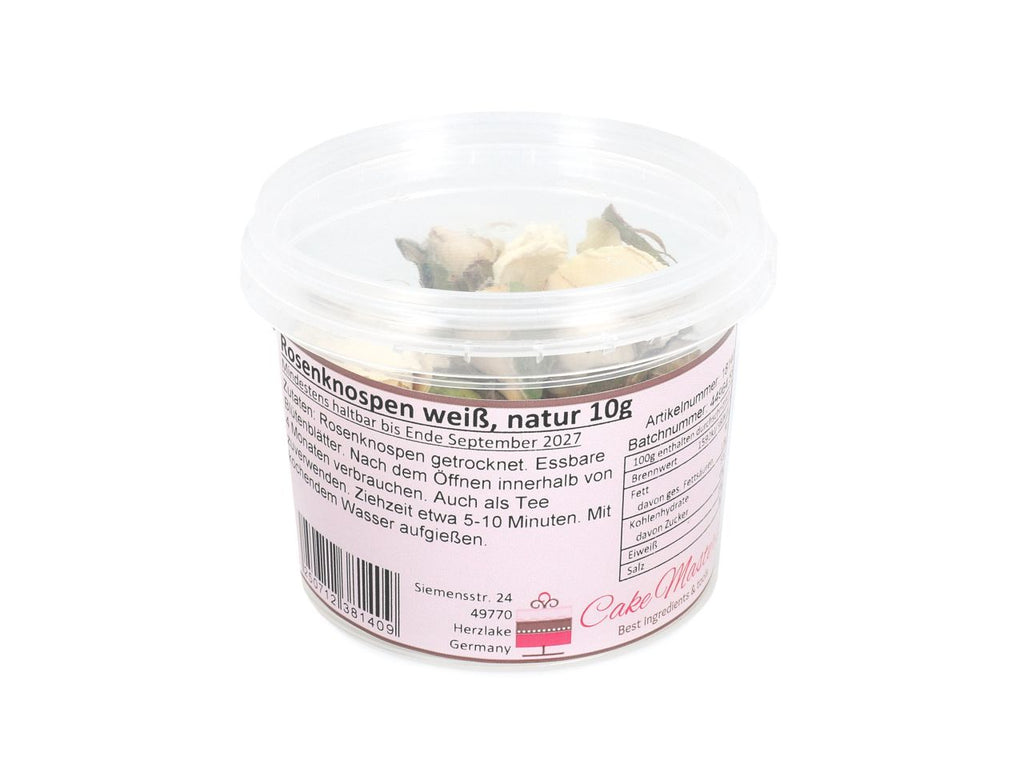 Die echten, getrockneten Rosenknospen eignen sich hervorragend Dekoration für beispielsweise Torten, Cupcakes, Desserts oder Salate.